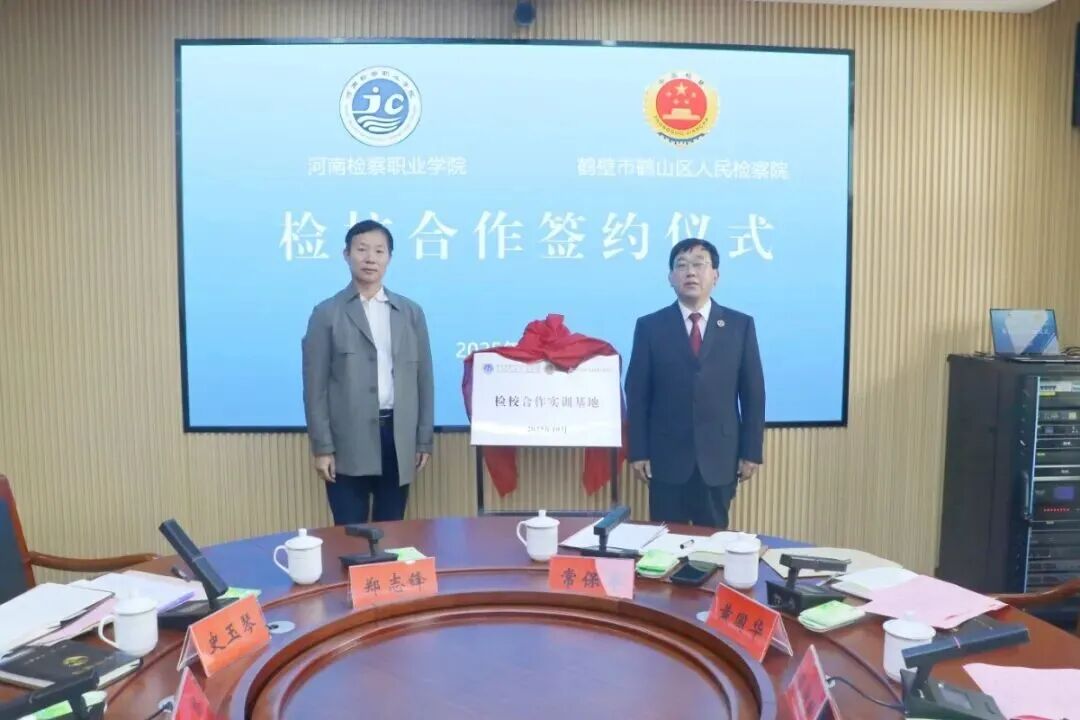 为深入贯彻落实最高检、教育部《关于加强新时代检察机关与高等学校合作的意见》精神,深化法学教育与检察实务的融合发展,构建检校资源共享、优势互补的战略合作格局,11月5日,河南检察职业学院与鹤壁市鹤山区检察院举行检校合作共建签约揭牌仪式。河南检察职业学院党委委员、副院长史玉琴,党委委员、副院长郑志锋,鹤壁市检察院政治部副主任黄国华,鹤山区检察院党组书记、检察长常保军等代表出席仪式并座谈。