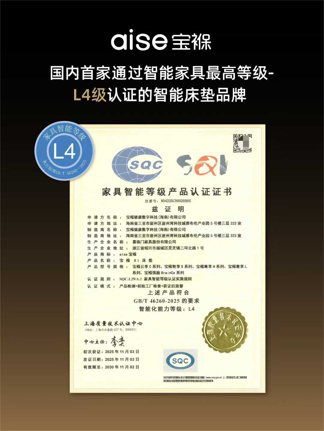 11月3日,喜临门旗下智慧睡眠生态品牌aise宝褓的“宝褓AI床垫”通过《家具 智能等级评定及标识》国家标准认证,成为国内首个荣获L4级最高等级认证的智能床垫品牌。