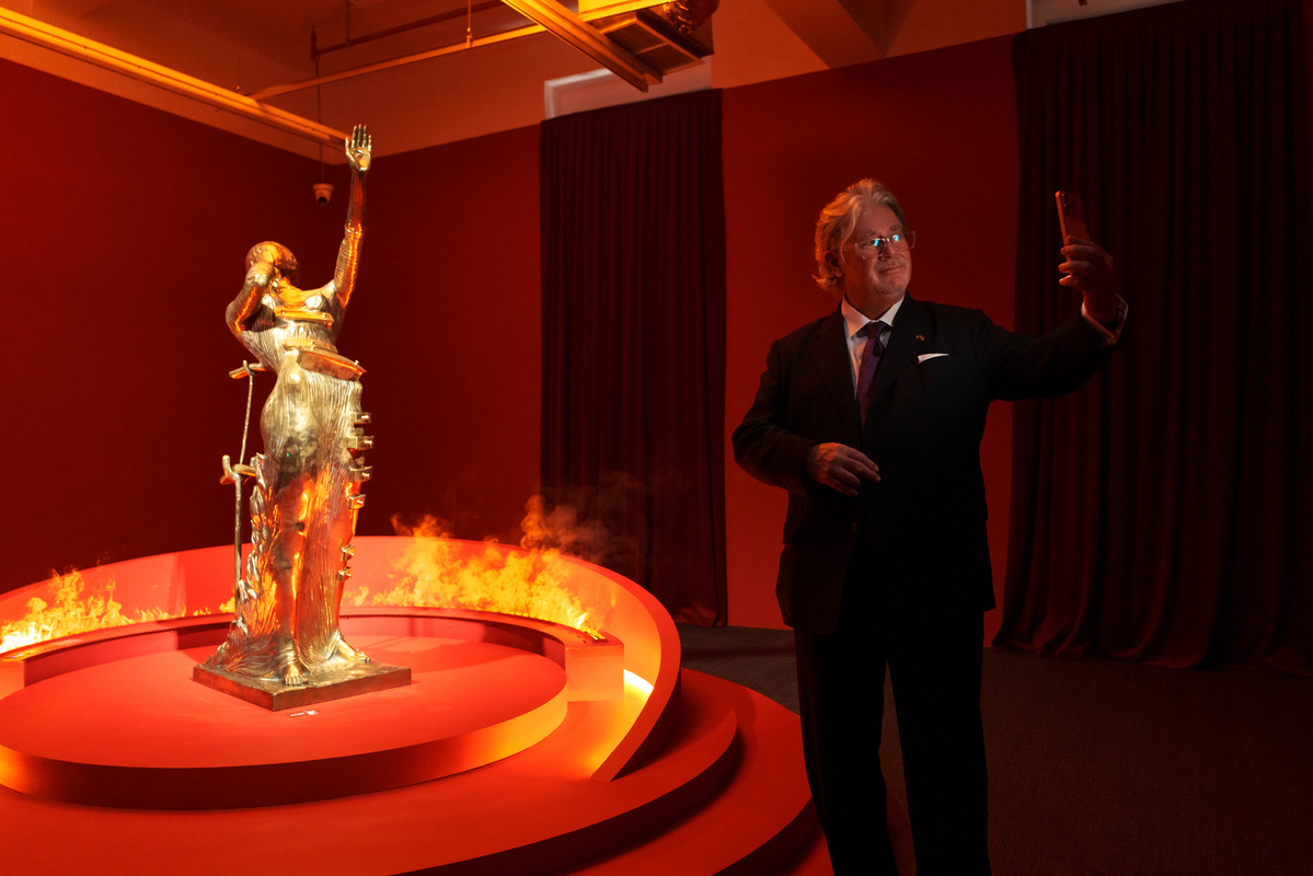 11月11日,研究达利作品的专家尼古拉斯·德尚在达利雕塑作品《燃烧的女人》前自拍。中国日报记者 高尔强 摄