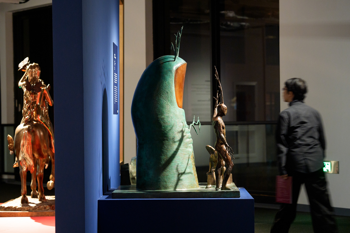11月11日,观众参观达利雕塑作品《天使的幻象》(右)与《戈黛娃夫人与蝴蝶》。中国日报记者 高尔强 摄