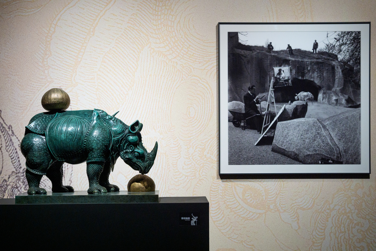 11月11日,达利雕塑作品《穿着蕾丝的犀牛》一旁展示了达利在动物园观察犀牛并作画的工作照。中国日报记者 高尔强 摄