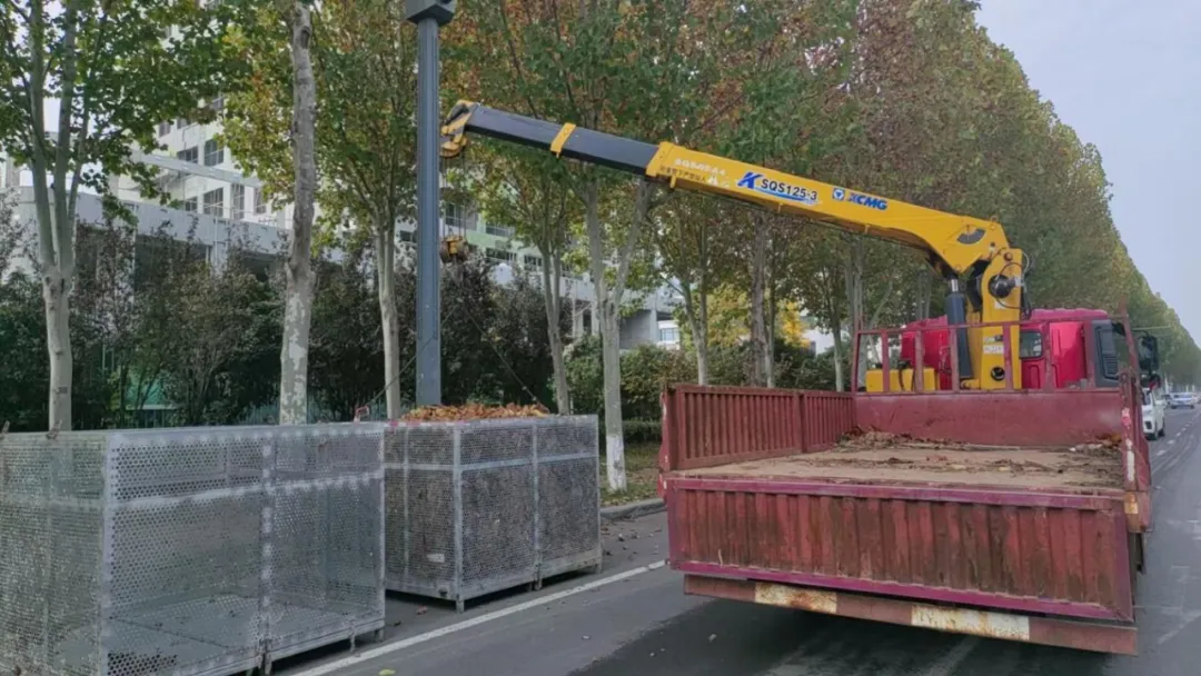 创新采用“铁笼周转”落叶收集模式,在城区主干道及重点区域布设定制落叶收集笼,实现800米范围内全覆盖,确保“有落叶有人清、清理有地方倒、收集笼满有吊运”。环卫工人将清扫的落叶集中装入铁笼,待笼体装满后,由专用车辆开展“笼体置换”作业,通过吊装设备将满载落叶的铁笼整体运离现场,同步替换为空置铁笼,形成“收集-转运-再收集”的闭环循环作业体系。该模式既有效解决了传统落叶堆放易散落、难清运的问题,又借助机械化吊装大幅提升了转运效率。