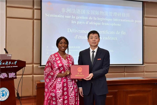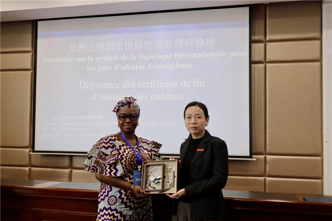 来自刚果(金)的研修班学员代表NTAMBWE BADIBANGA ADO表示,将认真学习中国在国际物流管理等方面的经验,促使本国物流行业不断发展。孙士俊为学员颁发结业证书,学员回赠纪念礼品。