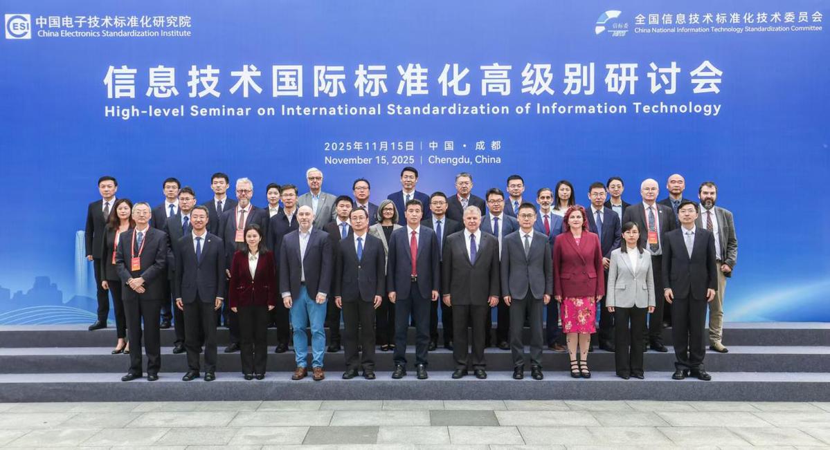 2025年11月15日,信息技术国际标准化高级别研讨会在成都召开。工业和信息化部副部长熊继军、国家市场监督管理总局(国家标准化管理委员会)标准创新管理司副司长郭晨光出席会议并致辞。国际标准化组织/国际电工委员会第一联合技术委员会(ISO/IEC JTC1)现任主席菲尔·温布洛姆、候任主席劳拉.林赛,国际标准化组织(ISO)技术团队负责人安德鲁.德莱顿,工业和信息化部电子信息司司长杨旭东、科技司副司长姚佳、信息技术发展司副司长李丽,四川省市场监管局党组成员、副局长高晓宇,中国电子技术标准化研究院副院长范科峰等领导专家参加会议。会议由中国电子技术标准化研究院党委书记、副院长刘贤刚主持。