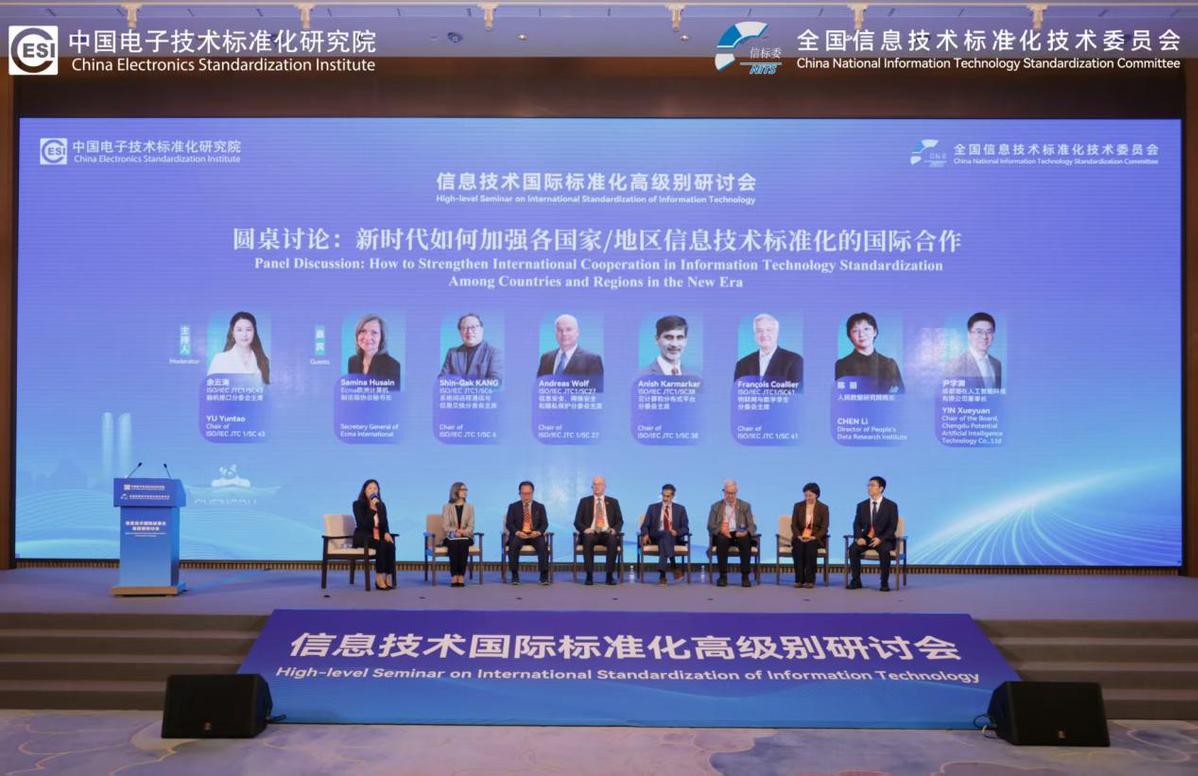 会议围绕“新时代如何加强各国家/地区在信息技术标准化国际合作”开展圆桌研讨。圆桌讨论环节由ISO/IEC JTC1/SC43脑机接口分委会主席余云涛主持,Ecma欧洲计算机制造商协会秘书长萨米娜·侯赛因、ISO/IEC JTC1/SC6系统间远程通信与信息交换分委会主席申国康、ISO/IEC JTC1/SC27信息安全、网络安全和隐私保护分委会主席安德烈斯·沃尔夫、ISO/IEC JTC1/SC38云计算和分布式平台分委会主席阿尼什·卡马卡尔、ISO/IEC JTC1/SC41物联网与数字孪生分委会主席弗朗索瓦·科亚利耶、人民数据研究院院长陈丽、成都潜在人工智能科技有限公司董事长尹学渊、中国科学院大学应急管理科学与工程学院教授李颖等专家参加研讨。