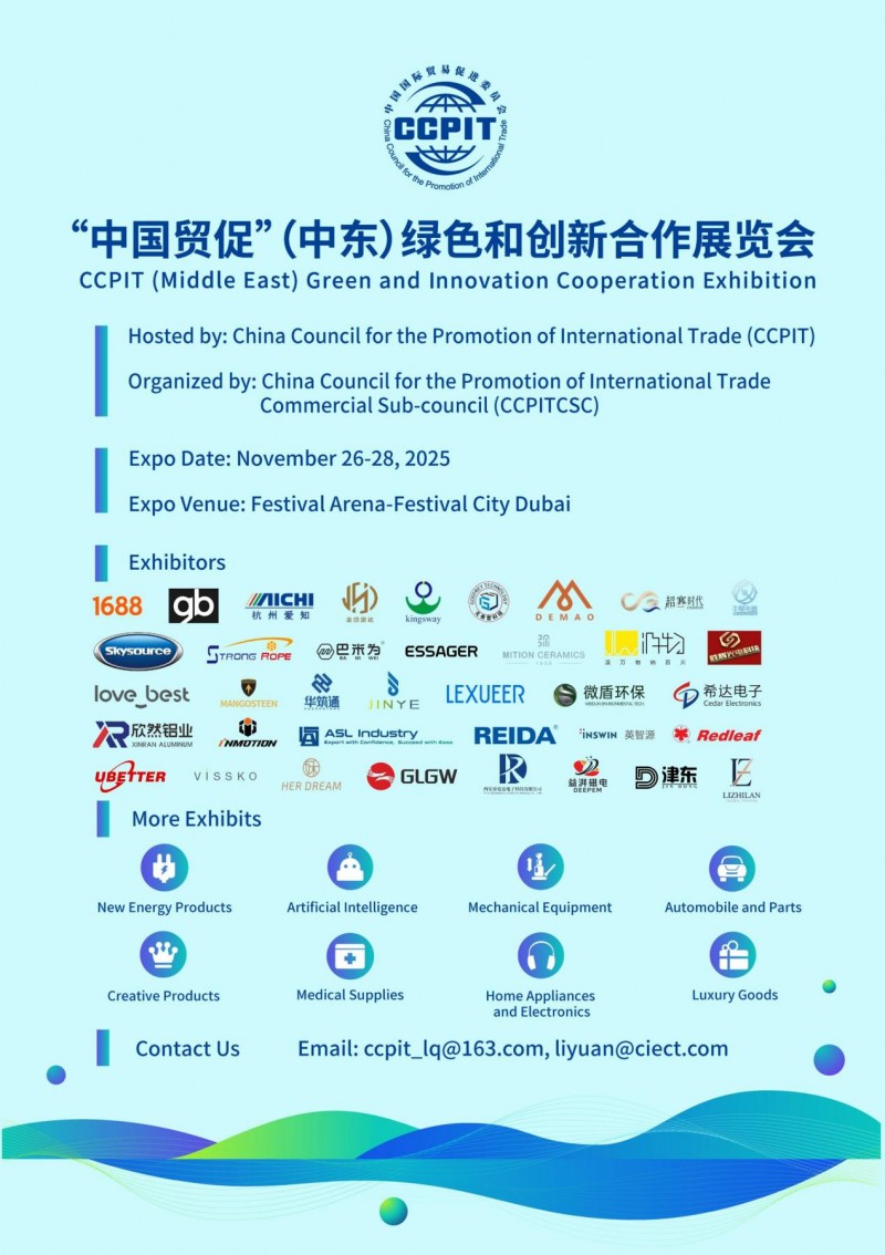 为助力中国企业更好的开拓阿联酋市场,深化国际交流合作,经国务院批准,由中国贸促会主办、中国贸促会商业行业委员会承办的“中国贸促”(中东)绿色和创新合作展览会(以下简称中东展),将于2025年11月26日至28日在迪拜节日城展览中心(Festival Arena-Festival City Dubai)举办。作为深化中阿经贸合作、推动技术创新交流的平台,本次展会旨在为双方优质企业搭建对接桥梁,助力企业发掘合作机遇。