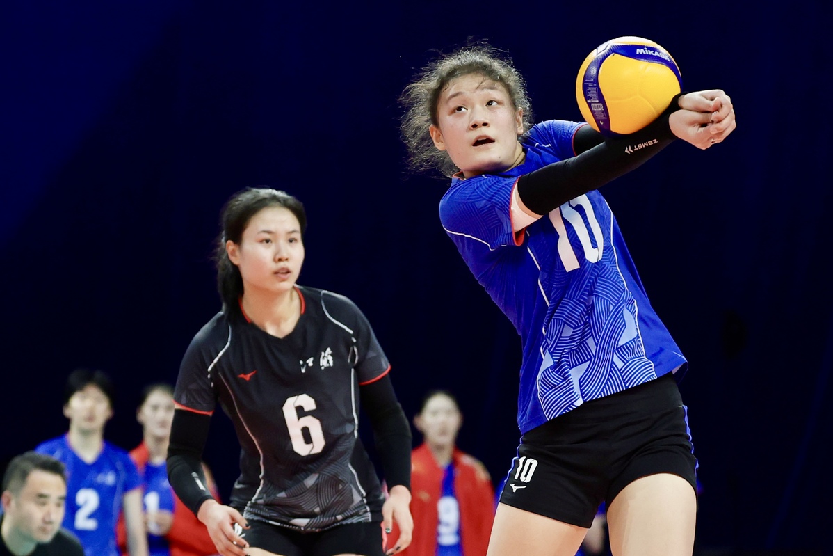 江苏队球员魏伊杉(右)在比赛中接球。中国日报记者 魏晓昊 摄