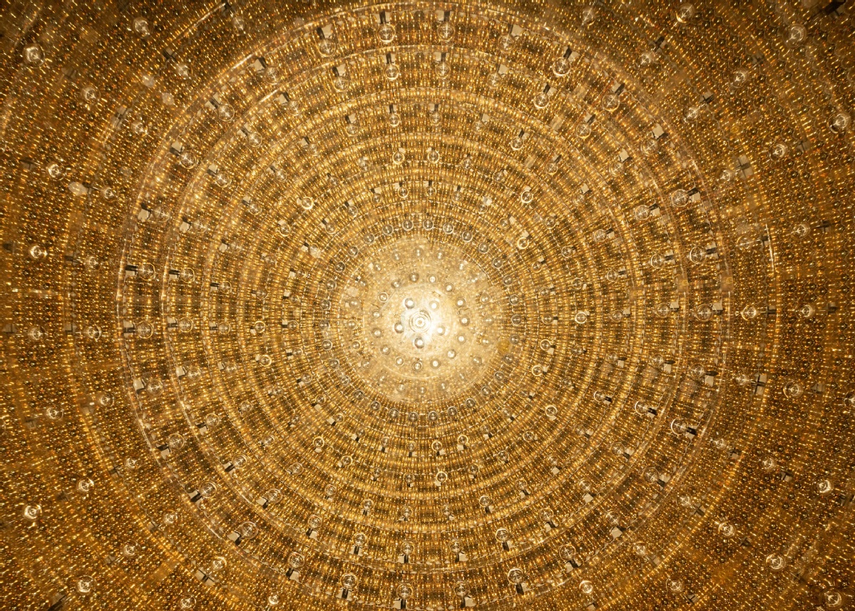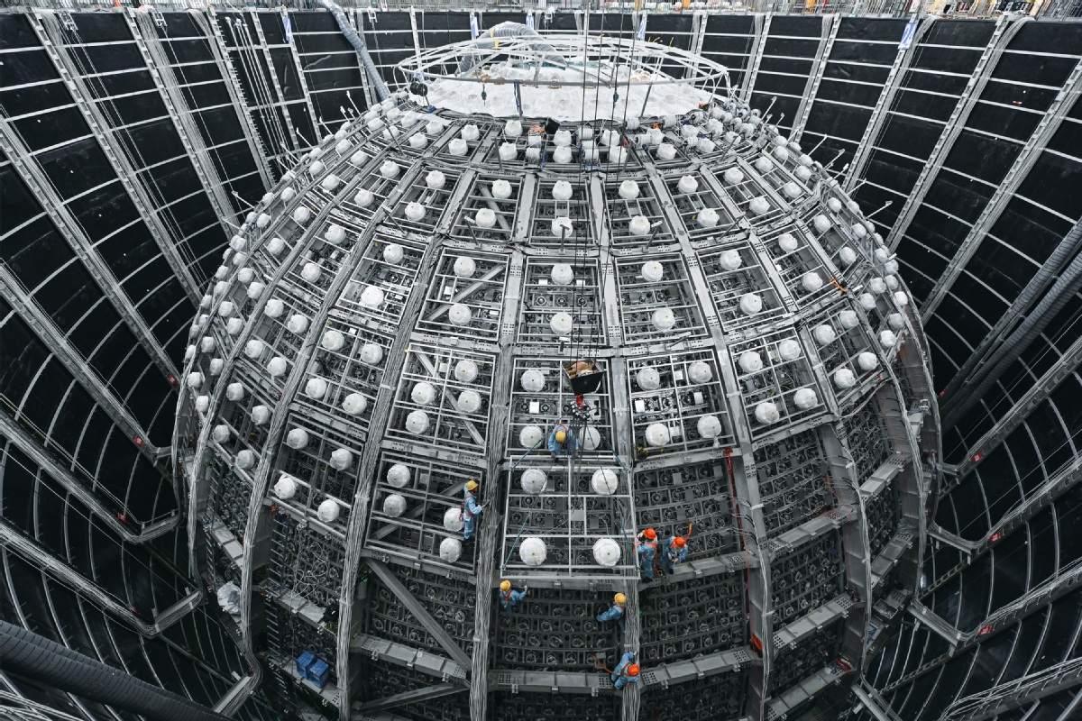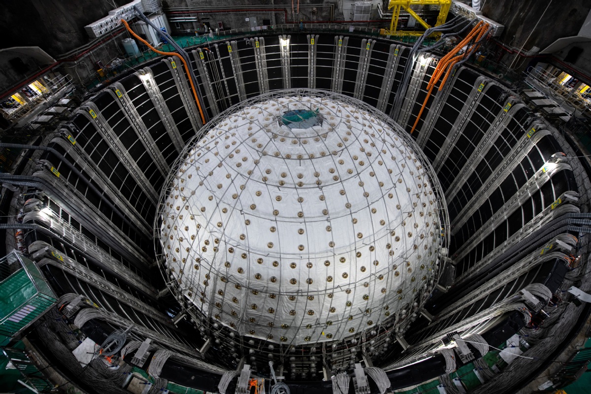 JUNO研发团队历经多年攻关,在高探测效率光电倍增管、超高透明度液体闪烁体、超低本底材料和精密刻度系统等核心领域实现重大突破。JUNO的核心探测器为有效质量达2万吨的液体闪烁体探测器,安置于地下实验大厅44米深的水池中央。直径41.1米的不锈钢网壳作为主支撑结构,承载了包括35.4米直径的有机玻璃球、两万吨液体闪烁体、两万只20英寸光电倍增管、两万五千只3英寸光电倍增管以及前端电子学、电缆、防磁线圈和隔光板等众多关键部件,共同构建起超高灵敏度的中微子探测系统。