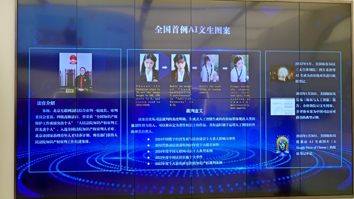实时数据大屏前,采访团成员认真聆听了北京互联网法院“全国首例‘AI文生图’著作权案”“全国首例‘AI声音权’案”等涉网典型案例介绍。这些案件不仅是司法实践的里程碑,更是引领数字经济规则的标杆。例如,在首例“AI文生视频”案件中,法院明确了AI生成内容的著作权归属,平衡了技术创新与权利保护,激发了文创产业的活力。该案例得到美、日、德多国关 注,成为达成全球共识的司法样本。这些案例生动展现了北京互联网法院积极应对前沿技术带来的法律挑战,引导新兴产业规范健康发展的裁判智慧。