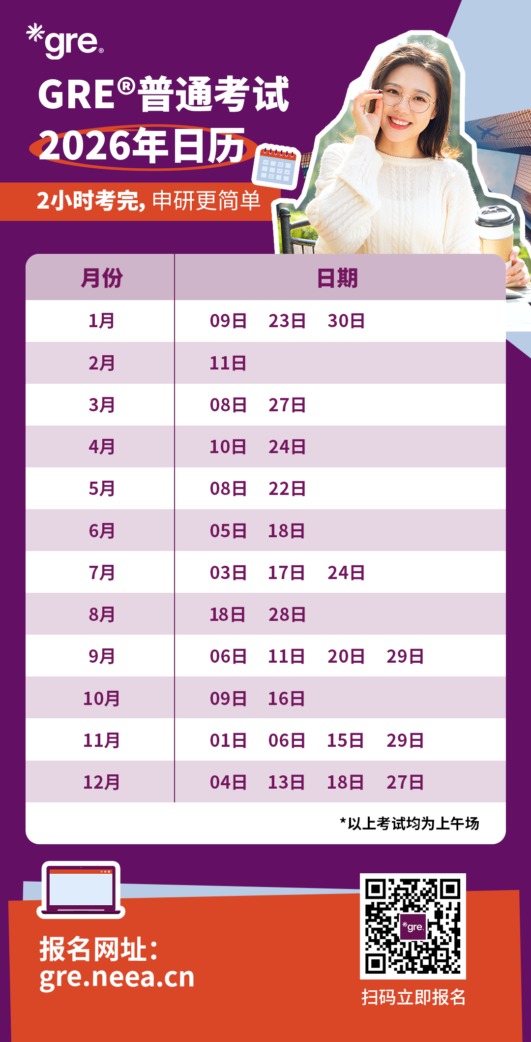 中国日报11月21日电 ETS与教育部教育考试院共同研究商议并决定于2025年11月21日17:30开放2026年的托福iBT考试和GRE普通考试的考位。2026年共开放47个考试日期的托福iBT考试和31个考试日期的GRE普通考试。2026年全年考试日期安排请见下表。