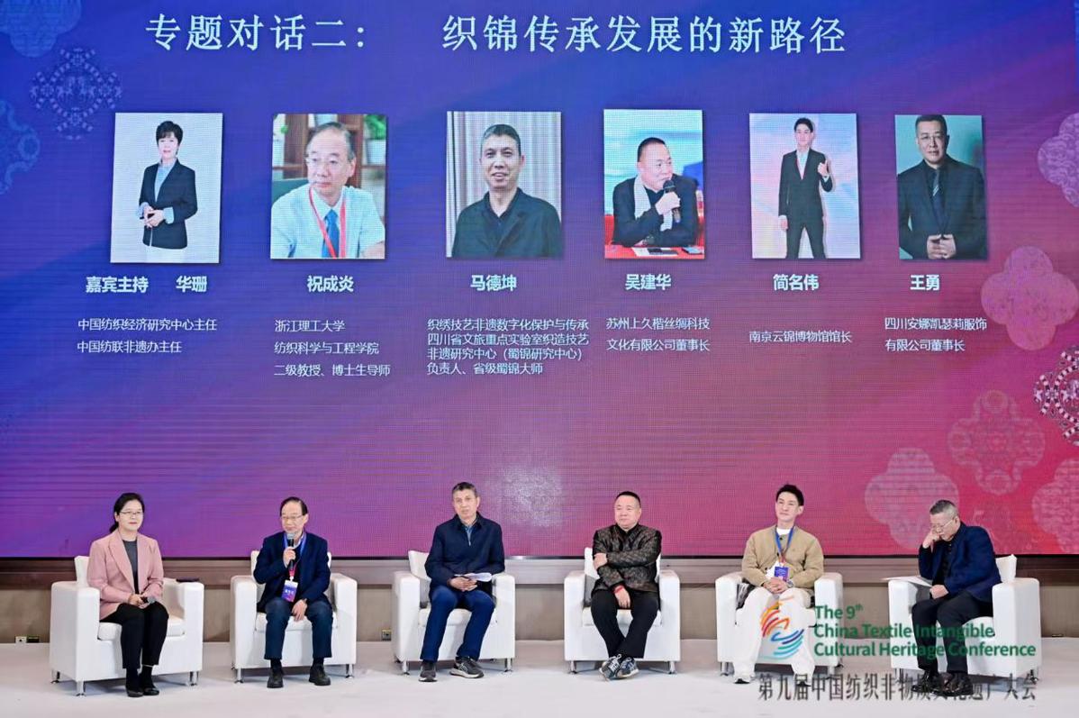 随后举行的“织锦传承发展的新路径”专题对话由中国纺织经济研究中心主任、中国纺联非遗办主任华珊主持。浙江理工大学纺织科学与工程学院二级教授、博士生导师祝成炎,织绣技艺非遗数字化保护与传承四川省文旅重点实验室织造技艺非遗研究中心(蜀锦研究中心)负责人、省级蜀锦大师马德坤,苏州上久楷丝绸科技文化有限公司董事长吴建华,南京云锦博物馆馆长简名伟,四川安娜凯瑟莉服饰有限公司董事长王勇,围绕织锦技艺的数字化保护、品牌化运营与国际化传播与产业化发展等展开深度交流。