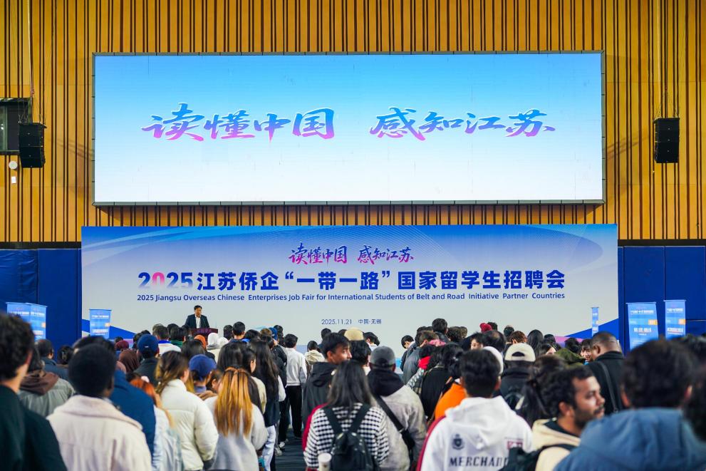 中国日报网无锡11月24日电 11月21日下午,“读懂中国 感知江苏”2025江苏侨企“一带一路”国家留学生招聘会在无锡学院体育馆举行。来自江苏省8所高校的近400名“一带一路”国家留学生与54家江苏侨企现场对接洽谈。