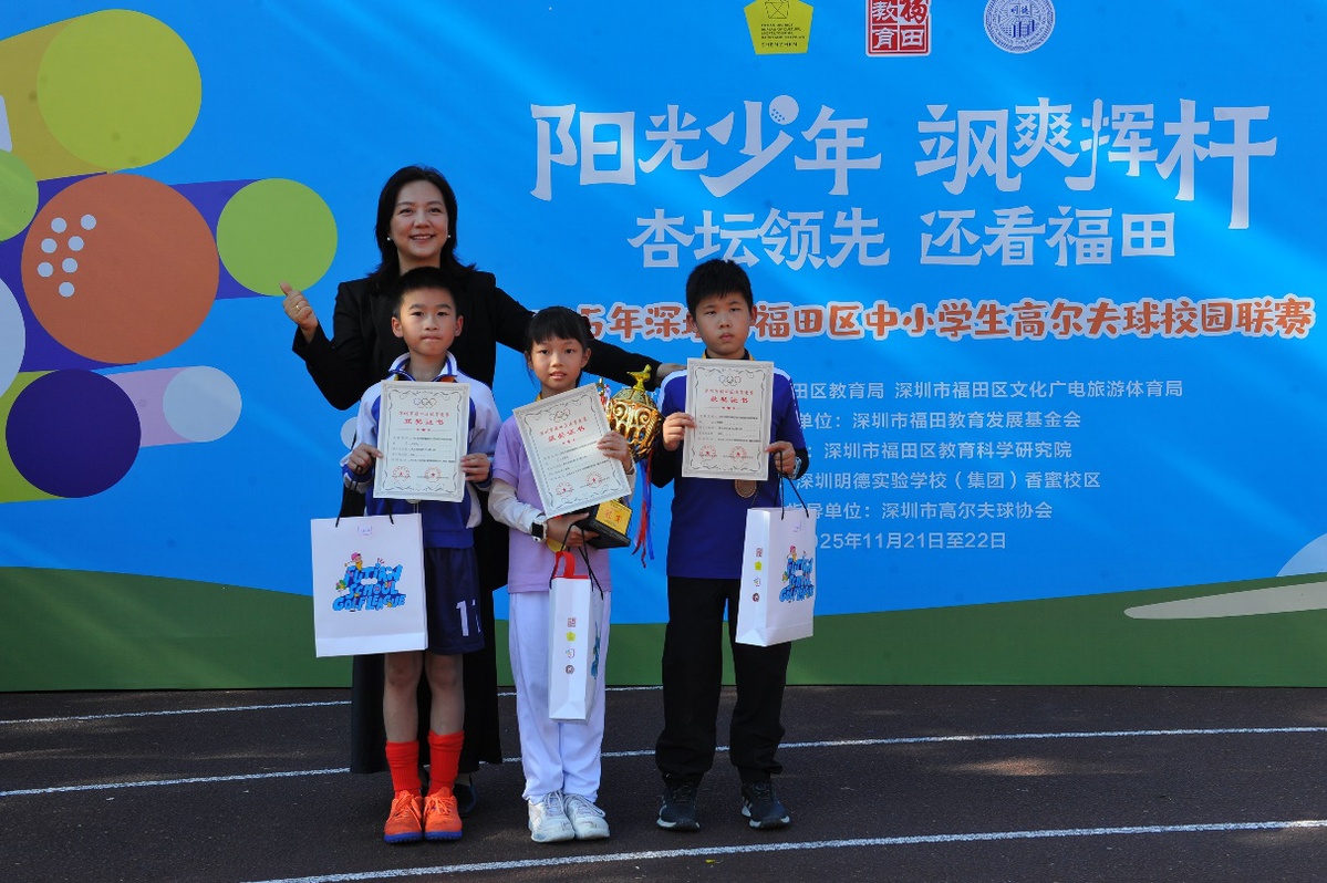 随着明德实验香蜜校区代表队欢呼雀跃地举起冠军奖杯,为期两天的2025年深圳市福田区中小学生高尔夫球校园联赛于11月22日下午,在深圳市明德实验学校(集团)香蜜校区画上了圆满的句号。经过两天跌宕起伏、悬念倍增的激烈比拼,主场作战的明德实验香蜜校区代表队以32分的高分,将本届联赛的团体冠军奖杯揽入怀中,园岭小学异军突起夺得了团体亚军,福田区外国语小学以两分之差获得团体季军。