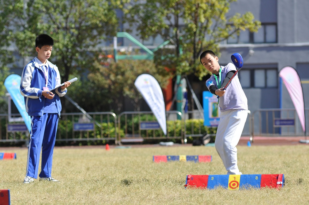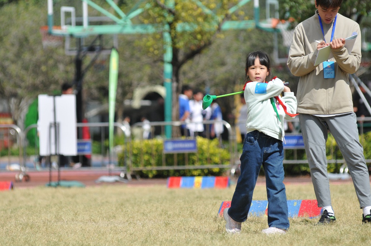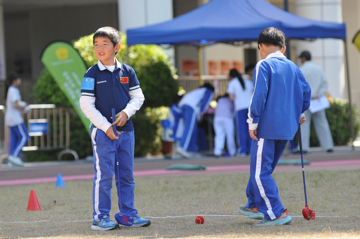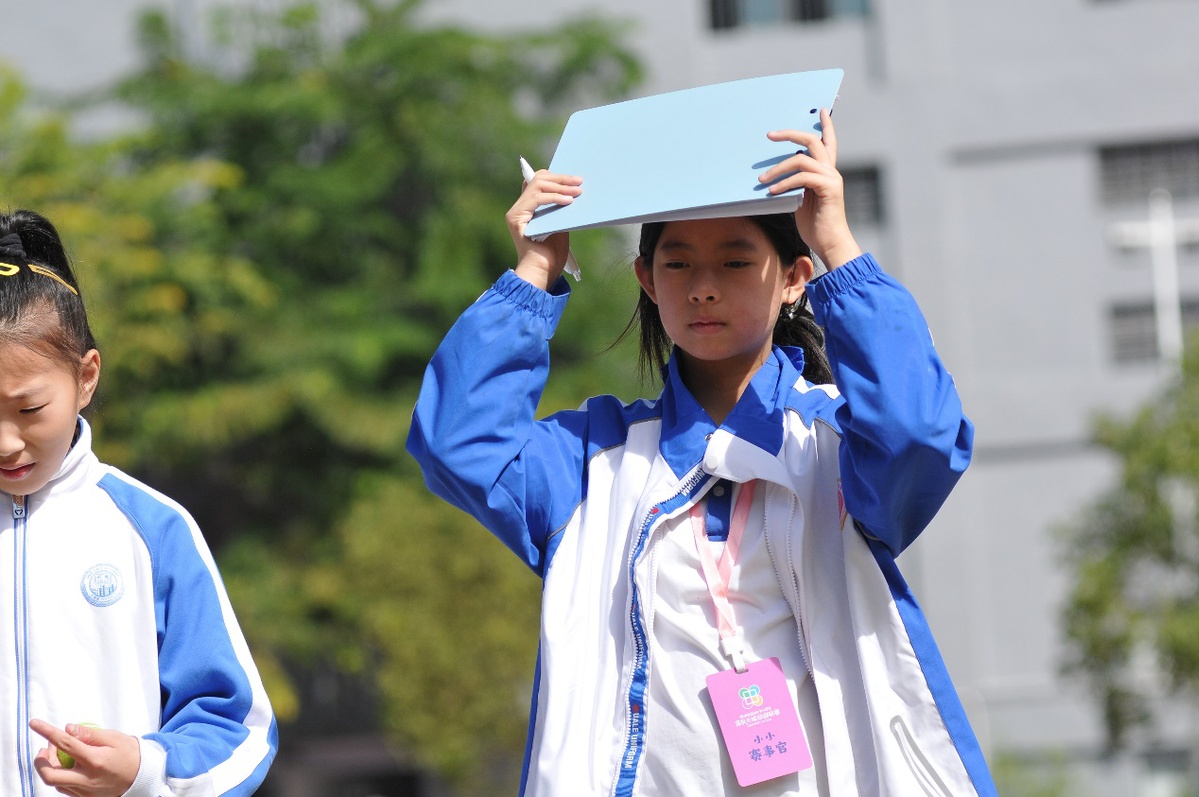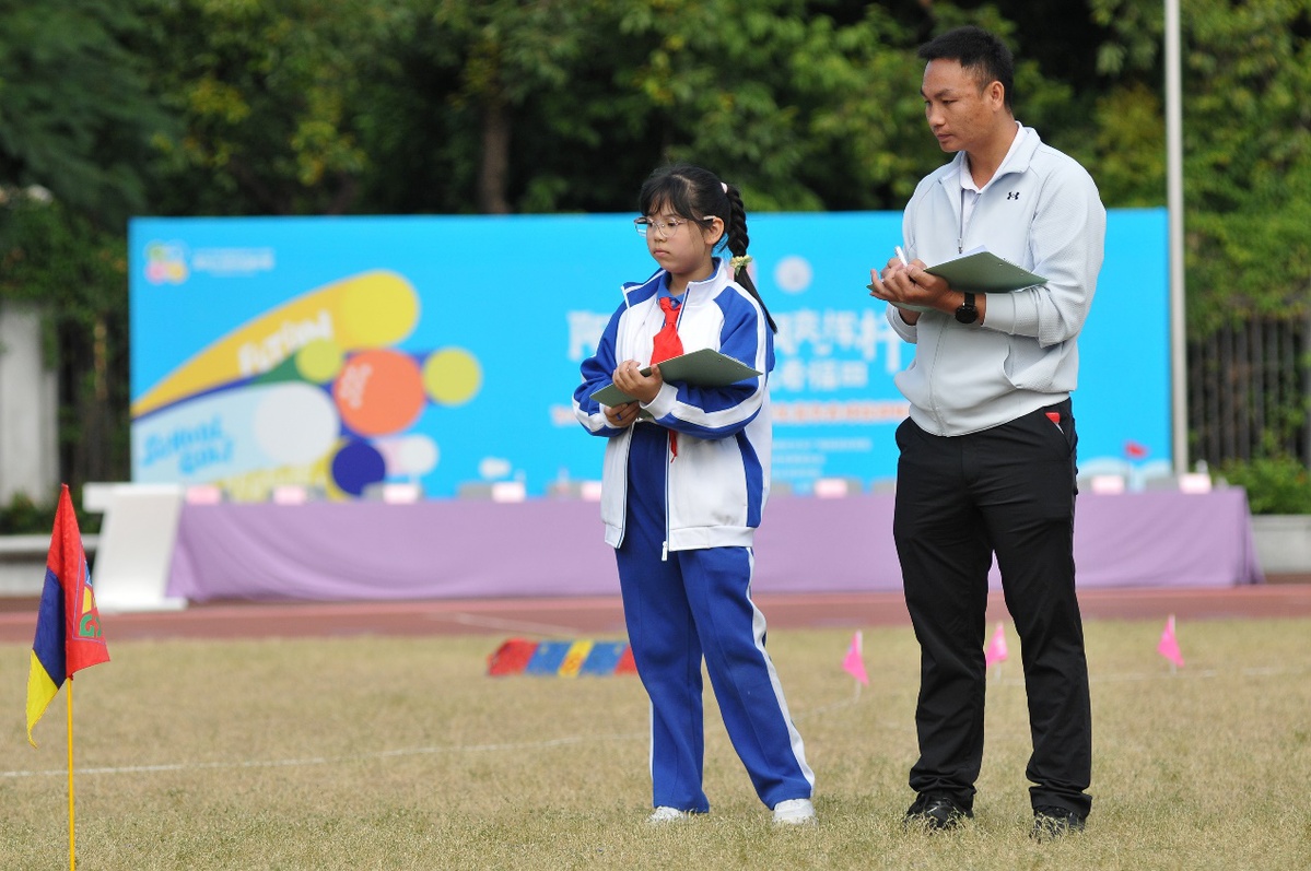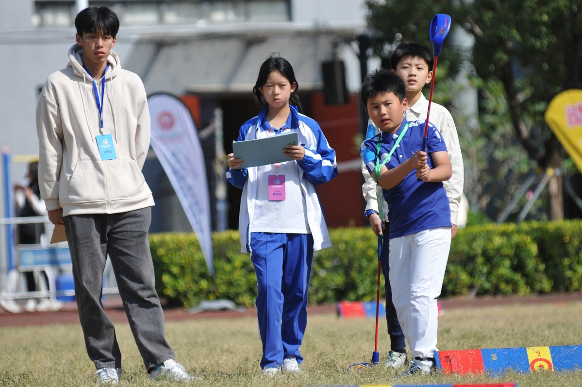 尤其让人交口称赞的是明德香蜜的黄琪涵同学,瘦瘦小小的姑娘,却有着大大的气场。她的岗位是小小出发员,面对出发台下200多名师生,小黄同学镇定自若,拿着厚厚一叠出发表,声音响亮地播报即将上场的各校队员名字。待参赛队员们来到出发台后,黄琪涵安排他们一字纵队站好,然后去装备处拿参赛球具,同时不停地叮嘱队员们“拿杆头、”“不要扔球”等。