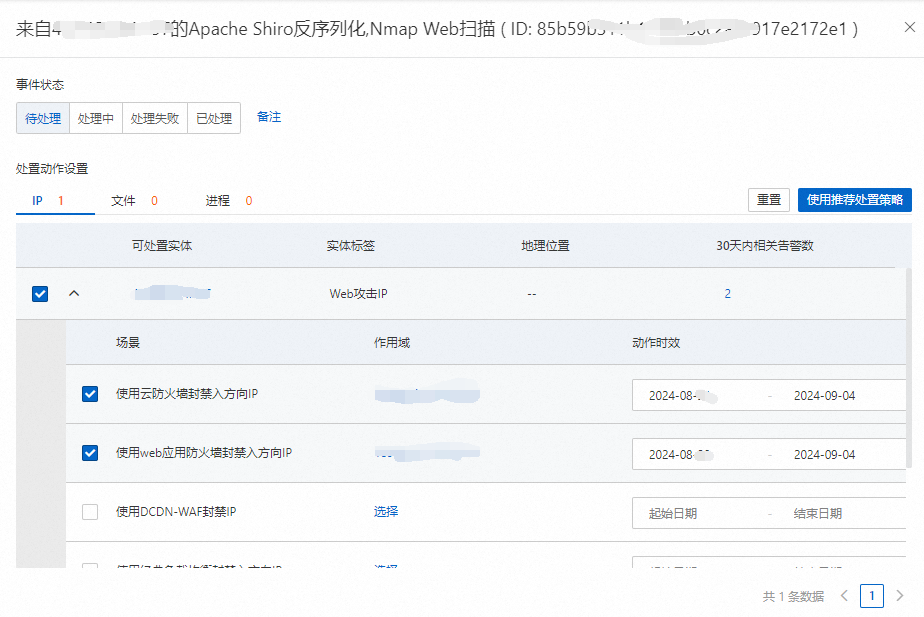 威胁分析与响应通过使用预定义的规则或自定义的规则,将关联的多个安全告警聚合成一个完整的安全事件,帮助我们迅速识别并对云产品的安全告警作出响应。定期检查并处理安全事件,可以提升云产品的安全水平并确保系统的完整性。可以选择手动处置或自动处置安全事件。