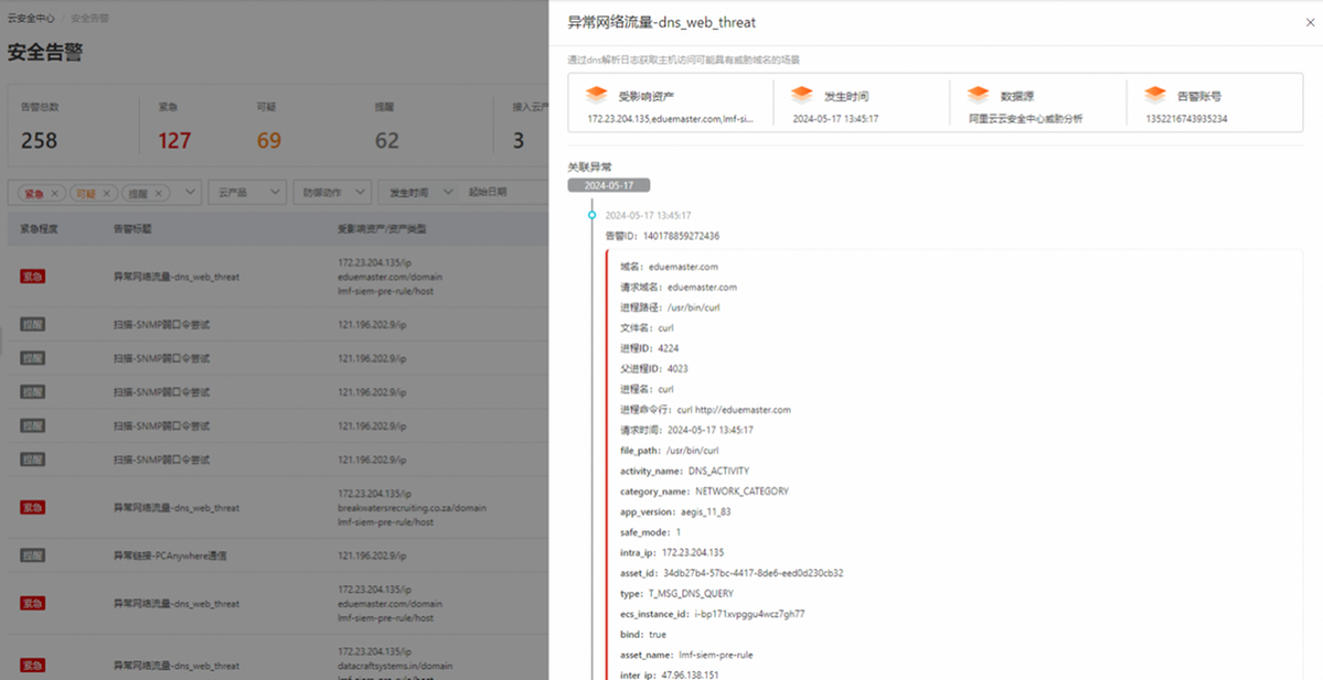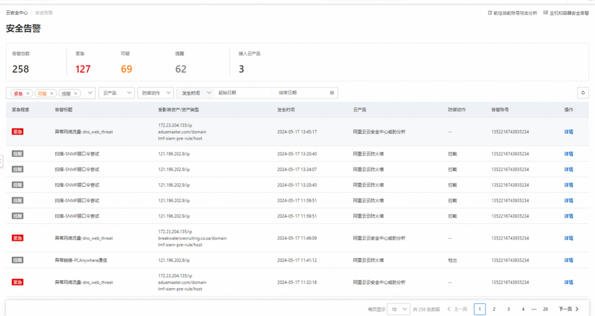 威胁分析与响应主要是通过集成多云、多账号和多产品的日志,利用预定义和自定义的安全检测规则,在检测到安全威胁时,威胁分析与响应能够启动自动化响应编排,联动相关云产品对威胁源执行封禁、隔离等安全措施,以实现快速且有效的安全事件处置。电商平台已将多个安全产品日志进行了接入,包括云安全中心、Web 应用防火墙、云防火墙、DDoS 防护、运维安全中心、云数据库、负载均衡 SLB日志等。日志接入后配置相关自定义规则实现自动发现出方向访问恶意网站的威胁情报告警&事件,与威胁情报进行实时检测,发现未知威胁、高级威胁、全网实时风险。通过自动化响应规则过滤目标告警,对告警中恶意实体进行自动化处置。由于威胁分析与响应能够联动相关的云产品进行处置,因此安全运维人员已由原来在多个云安全产品中查看、分析、处置安全事件,改为只集中在威胁分析与响应平台查看已自动处置的安全事件和查看规则未覆盖的事件并进行手动处置,无须在多个安全产品之间来回切换,处置速度更迅速。下图为安全事件告警列表: