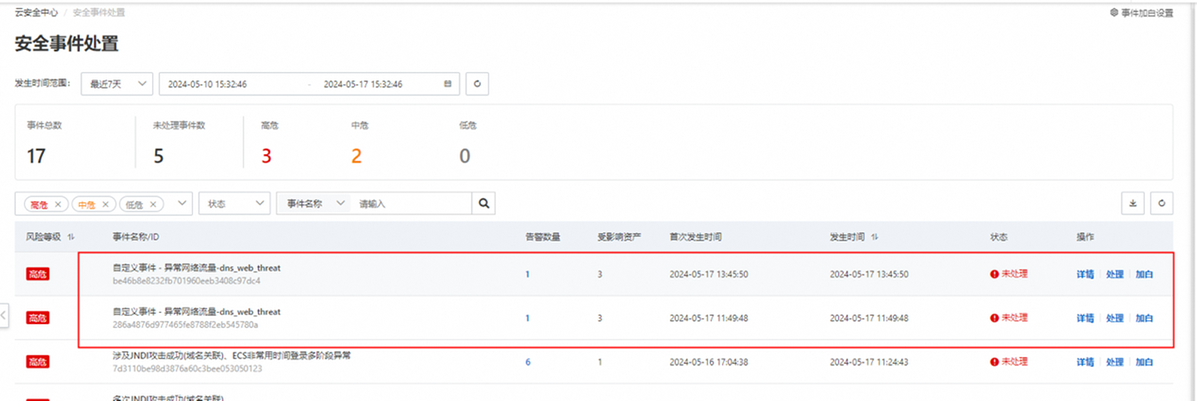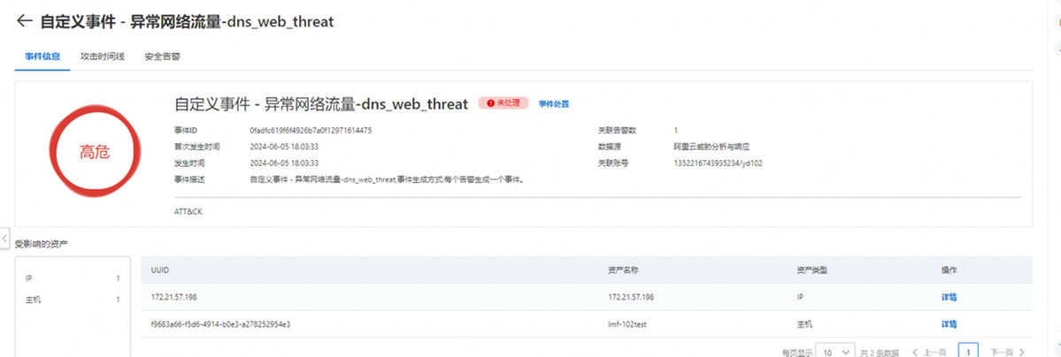 通过“威胁分析与响应-安全事件处置”的事件列表看到自定义规则产生的事件如下图所示: