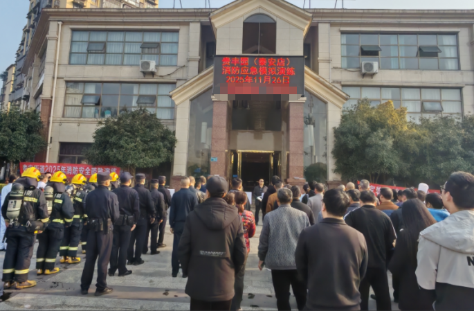 浓烟“四起”,警报骤响——在泰安街道贵丰园餐饮店内,一场模拟后厨起火的消防安全疏散演练正式启动。演练中,贵丰园二楼后厨因“电器线路短路”突发火情,火势快速蔓延。餐饮店工作人员第一时间切断电源、拨打“119”,同时用扩音器引导店内员工与就餐客人弯腰捂口鼻,沿安全通道快速撤离;泰安街道指挥部同步调度派出所、卫生院、消防救援站等力量到场,参演人员分工开展现场警戒、余火扑灭、受伤人员转运等工作,在较短时间内便高效完成全部疏散与处置流程。