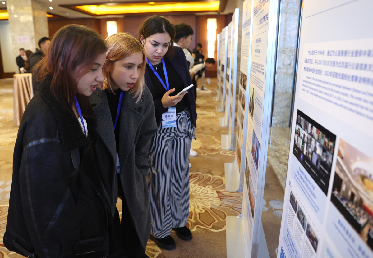 11月26日,参会外国留学生参观“民间组织服务开放发展”主题展览。中国日报记者 邹红 摄