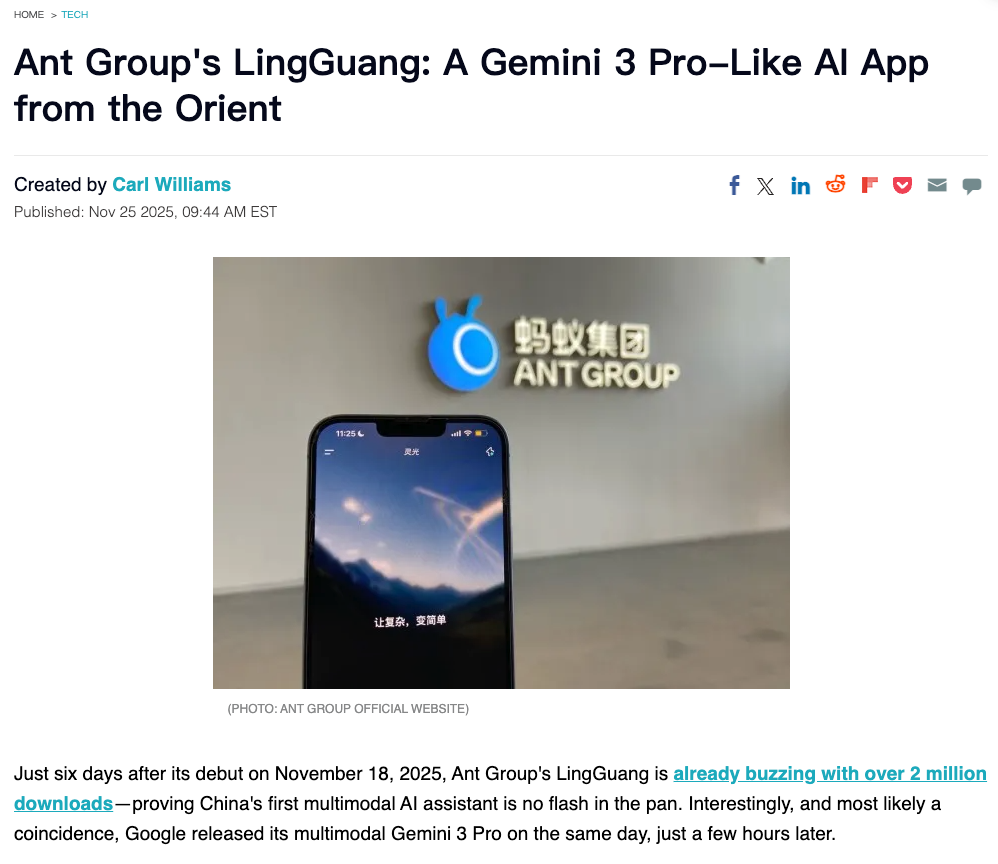 Tech Times在报道中指出,发布仅六天后,蚂蚁集团的灵光就吸引了超过200万次下载一一证明中国首款多模态AI助手并非昙花一现。“有趣的是,这很可能只是巧合,谷歌在同一天稍晚些时候发布了其多模态Gemini3 Pro。”