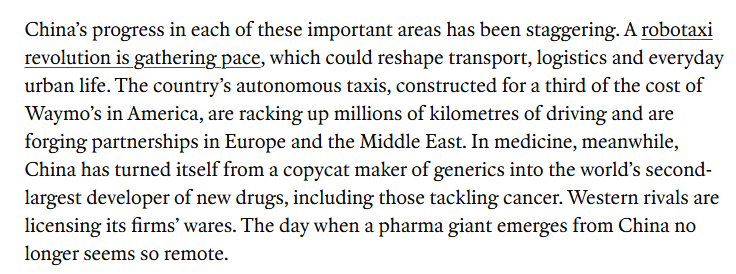 文章认为,中国正在自动驾驶和新药两个前沿技术领域加速向前推进,随着这些产业在全球范围内的发展,它们将充分展现中国强大的创新力量。