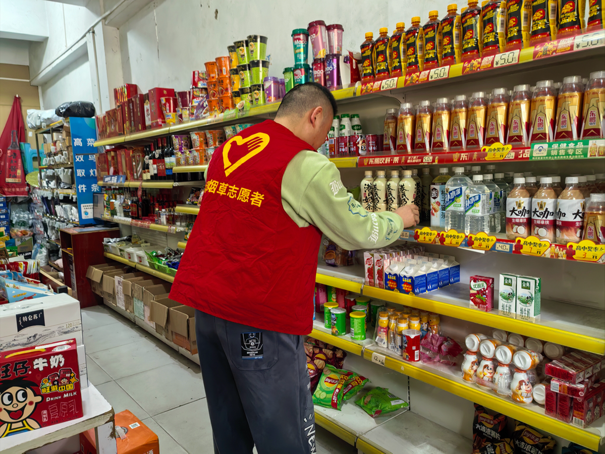 图为纳溪烟草志愿者帮助罗玲整理店铺
