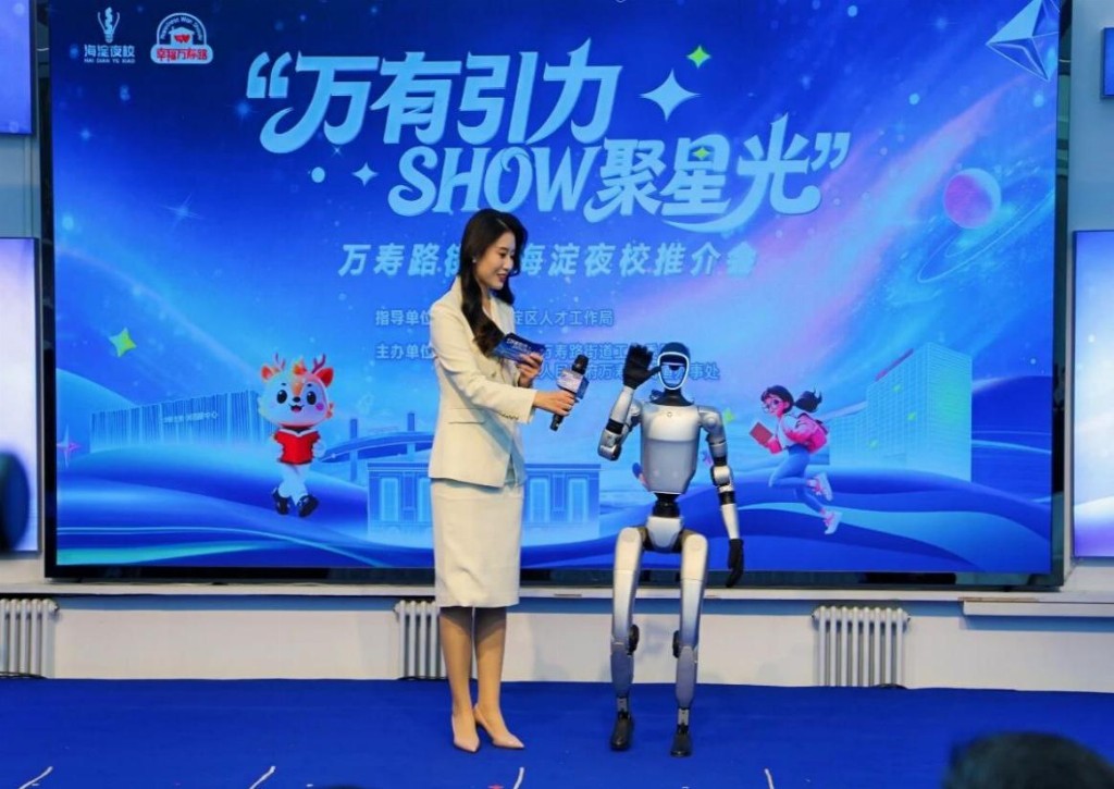 活动现场亮点纷呈,科技元素与人文气息相互交融。在AI机器人“小鹿”与主持人的互动对话中,活动正式开始。这位“科技代言人”以充满未来感的方式,生动诠释了夜校“一核四圈多星”的空间布局与“区域夜校+基层夜校”双轨服务体系。随后,《万寿路街道海淀夜校体系》宣传片沉浸上映,镜头穿梭于居民专注学习的脸庞、讲师倾囊相授的瞬间,记录下从一粒初心种子到枝繁叶茂的成长轨迹,绘就了一幅“人人皆学、处处能学、时时可学”的鲜活画卷。