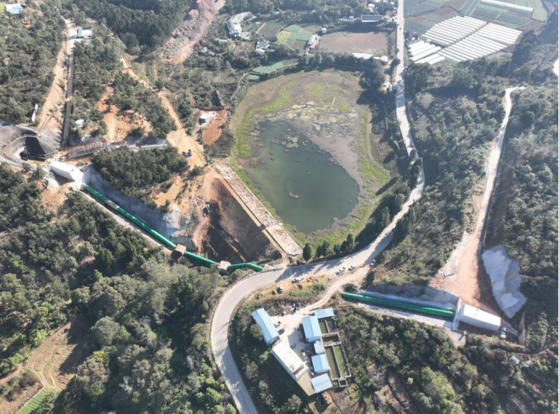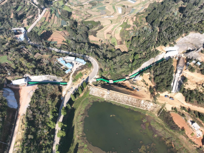 作为滇中引水工程核心输水干线,小龙潭倒虹吸承担着水资源精准调配的关键功能,其穿越构造剥蚀中山地貌、横穿老玉江公路及抵近既有天生桥水库施工,都对施工技术和施工组织提出极高要求。进口段地形坡度约30°- 40°;出口段地形坡度约30°- 60°;中部发育一条NW向冲沟,宽约20m。管槽狭窄且无天然吊装平台,钢管运输、就位和焊接均面临严峻挑战。为破解施工难题,项目部一是联合参建各方组建技术攻关小组,按照“合理布局、重点把控”的原则,优先组织基槽开挖支护、支墩施工,镇墩间管节吊装加设临时固定支撑等措施,确保工程安全推进。二是“结合地形、疏排结合”的思路,采取修建排水沟和导流工程,加强水文监测等措施,确保施工期间不受水流影响。三是面对跨路高空作业风险高、交通疏导复杂等挑战,项目科学制定专项方案,与交通管理部门密切协作,优化交通分流路线,实现施工与道路通行“双安全”。