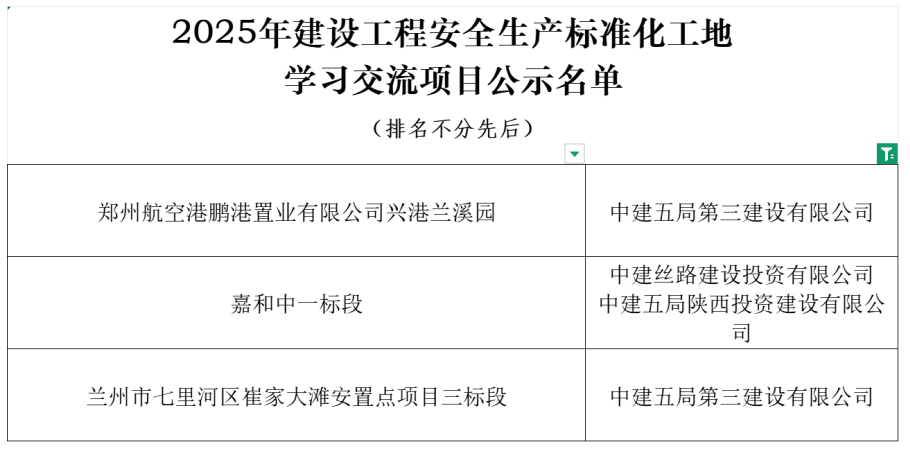 近日,中国建筑业协会公布了2025年全国建设工程安全生产标准化工地评选结果,中建五局三公司西北公司嘉和中心一标段、郑州航空港兴港兰溪园、兰州崔家大滩安置点项目三标段上榜。