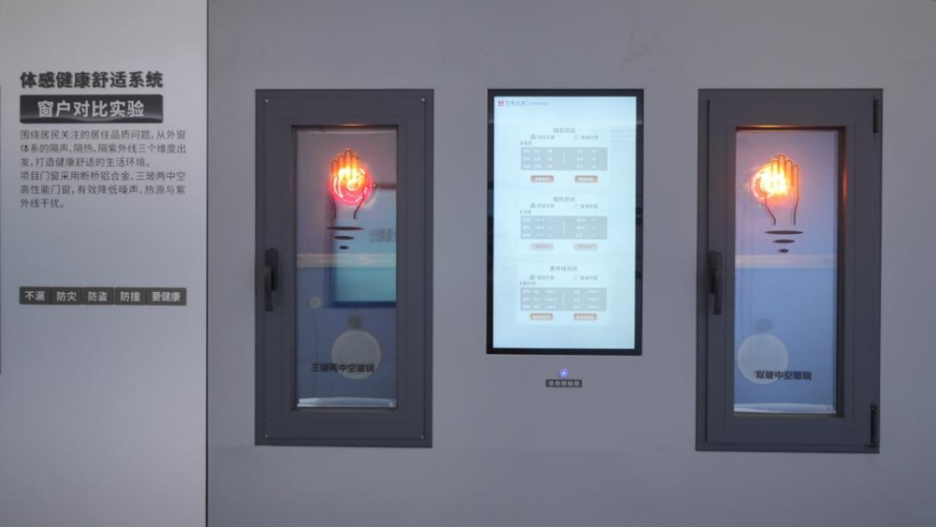 房屋窗户和楼板的防噪音性能也是影响居住体验的一个重要方面。采访人员在现场看到两组降噪比对实验:一组是外窗降噪实验,最新推出的“三玻两中空”优质窗户,比普通窗户在隔音、隔热、隔紫外线三个维度上均实现性能大幅跃升;楼板隔音性能关系生活舒适度和邻里关系,企业与清华大学建筑声学实验室合作进行楼板降噪实验,新型楼板增加橡胶隔声减震垫,形成隔音屏障,比普通楼板噪音阻隔性能有大幅提升,隔音效果更好。