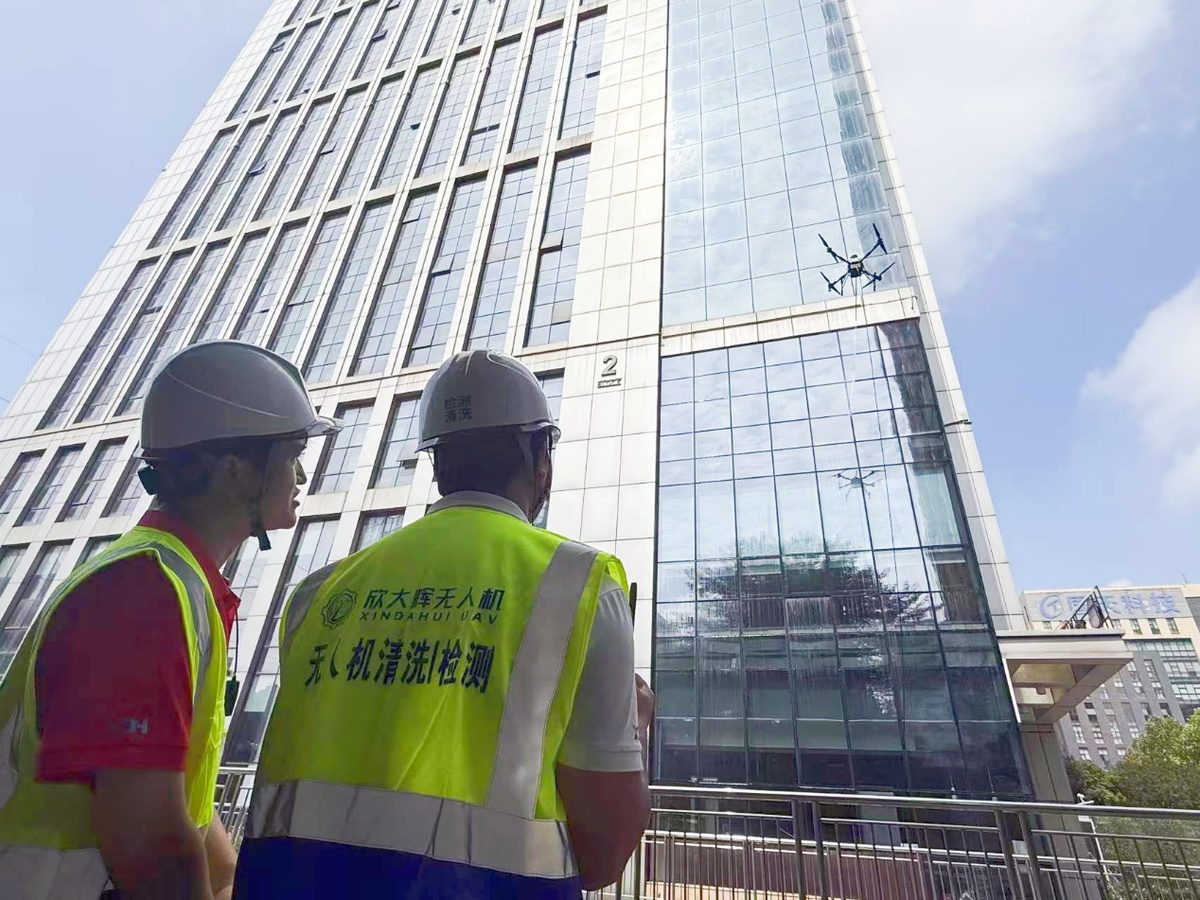 湖南长沙,无人机正在开展高空玻璃清洗作业。