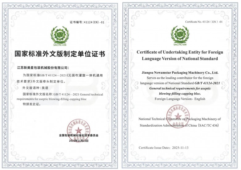 公开资料显示,新美星自成立以来累计主持和参与制订国内外各类标准40余项。2024年,由该公司牵头起草的《无菌吹灌旋一体机通用技术条件》外文版正式发布,成为我国包装机械行业首个外文版标准。