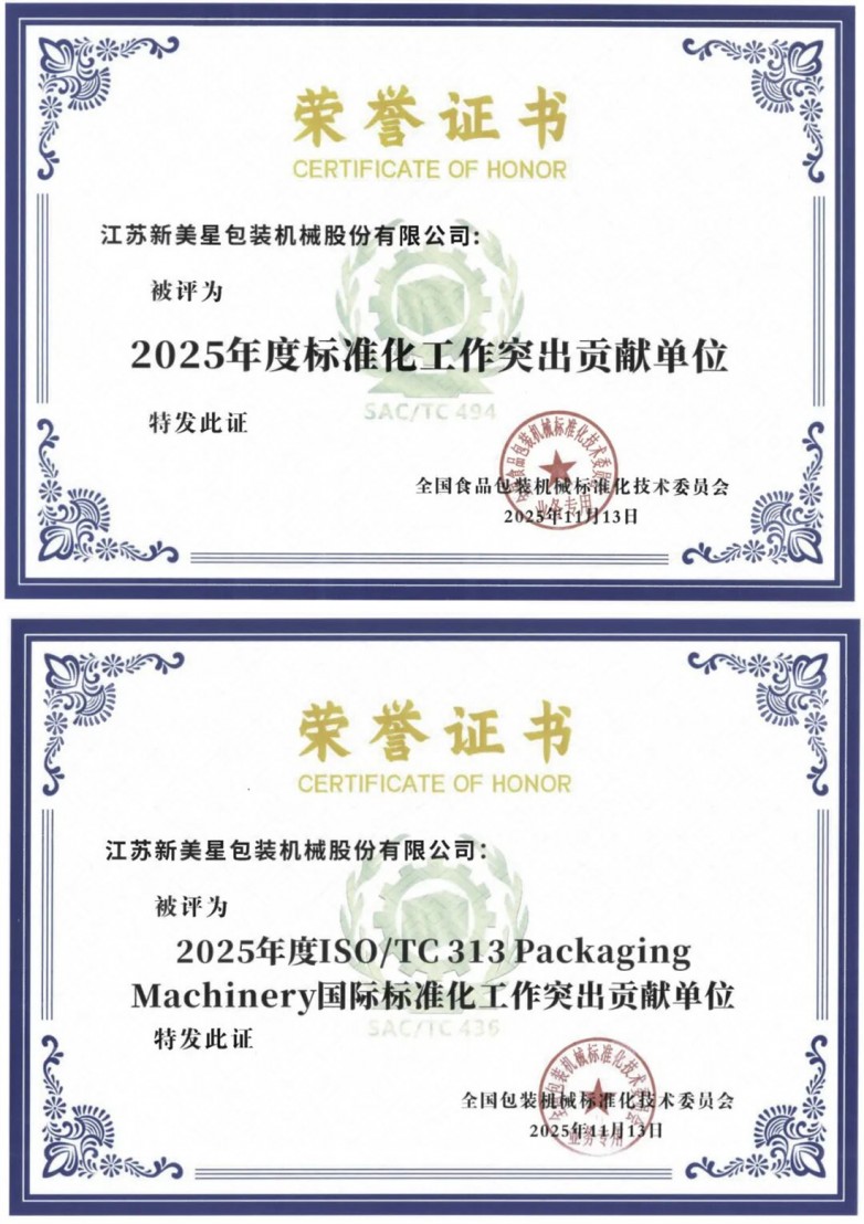 据悉,江苏新美星包装机械股份有限公司在本次会议上获得"2025年度标准化工作突出贡献单位""2025年度国际标准化工作突出贡献单位"等称号,并获颁"国家标准外文版牵头制定单位证书"。