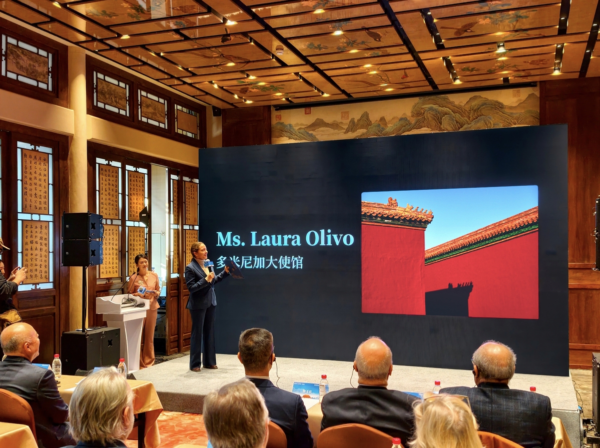 现场,年度外交官摄影获奖作品揭晓,相关领导及嘉宾为获奖者颁奖。一等奖获得者、多米尼加共和国驻华大使馆二等秘书劳拉·奥利沃(Laura Olivo)发表获奖感言:“故宫的景色非常美丽,天空湛蓝,屋檐上的五个脊兽倒映在红墙上,用手机就拍到了这样一张好照片。”