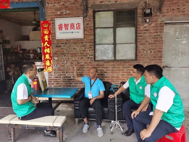 志愿者与中山市小榄镇睿智包装食品店零售户梁恩照围坐谈心