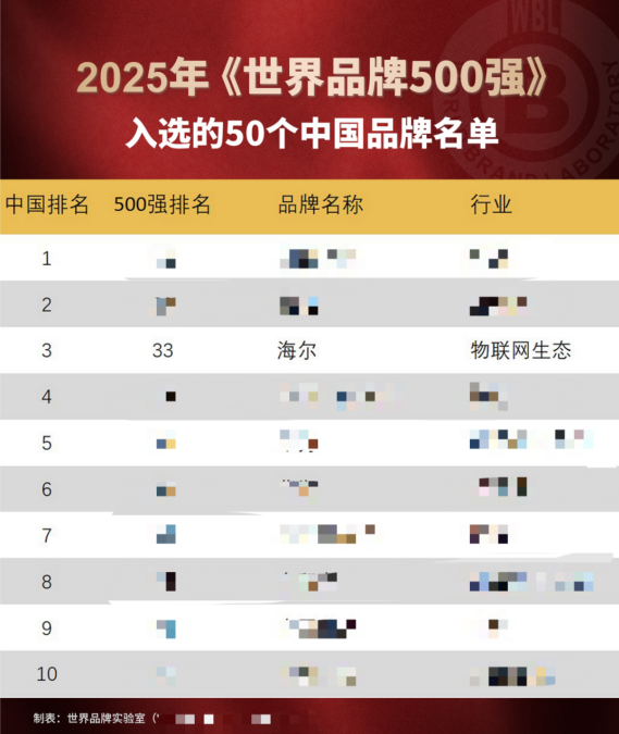 12月17日,世界品牌实验室正式发布2025年度(第二十二届)《世界品牌500强》榜单。50个中国品牌入选,总数超越日本,稳居全球第三,展现出中国企业不断提升的全球竞争力。其中,海尔已连续22年上榜,位列全球第33名,并稳居中国品牌前三。