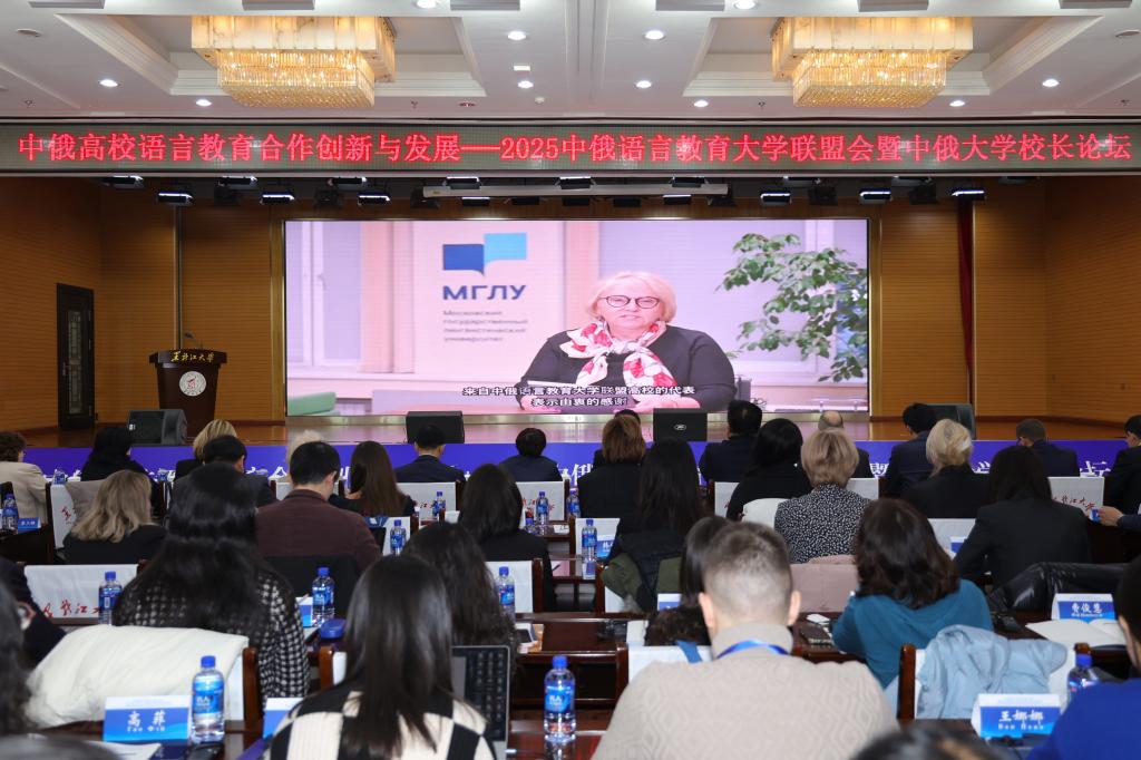 莫斯科国立语言大学校长克拉耶娃视频致辞。她回顾了2025年中俄双方建设联盟的协作成效,并表示莫斯科国立语言大学将致力于青年人才培养,持续深化务实合作,推动联盟的高质量发展。