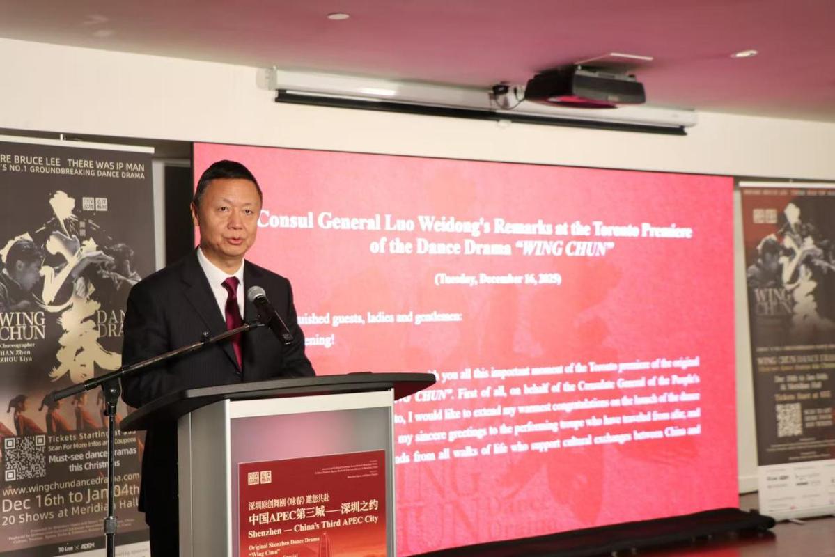 罗伟东总领事在首演活动上表示,很高兴与各界嘉宾共同迎来舞剧《咏春》在多伦多首演的重要时刻,并代表中国驻多伦多总领事馆,对《咏春》开展海外驻演表示祝贺,向演出团队和长期支持中加文化交流的各界人士致以感谢。