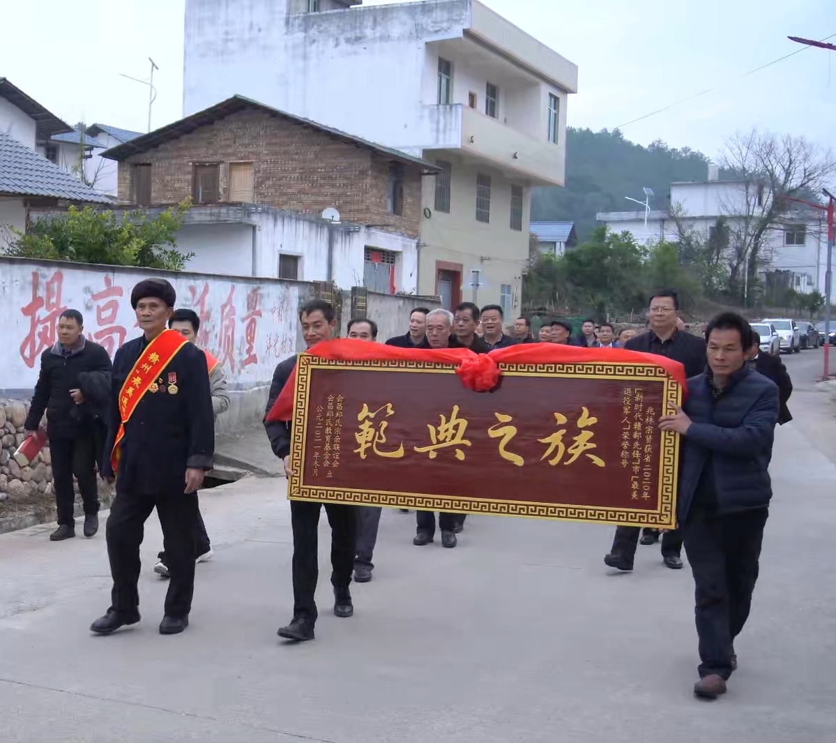会昌郑氏宗亲会为中村乡洋光村抗美援朝老兵郑兆林立匾(摄影:黄振荣)