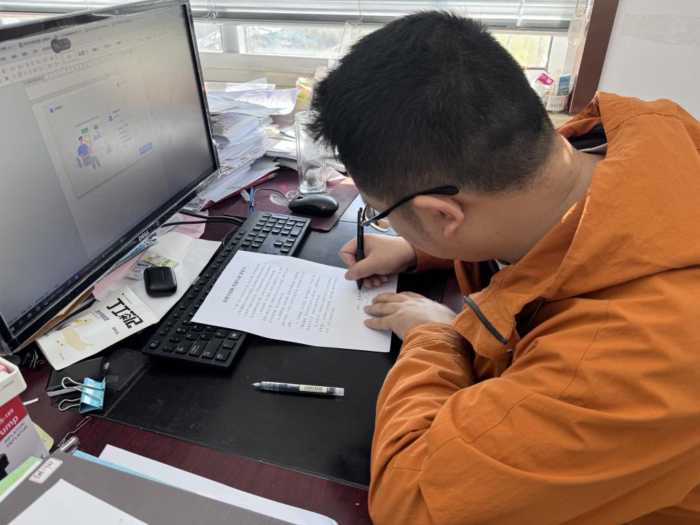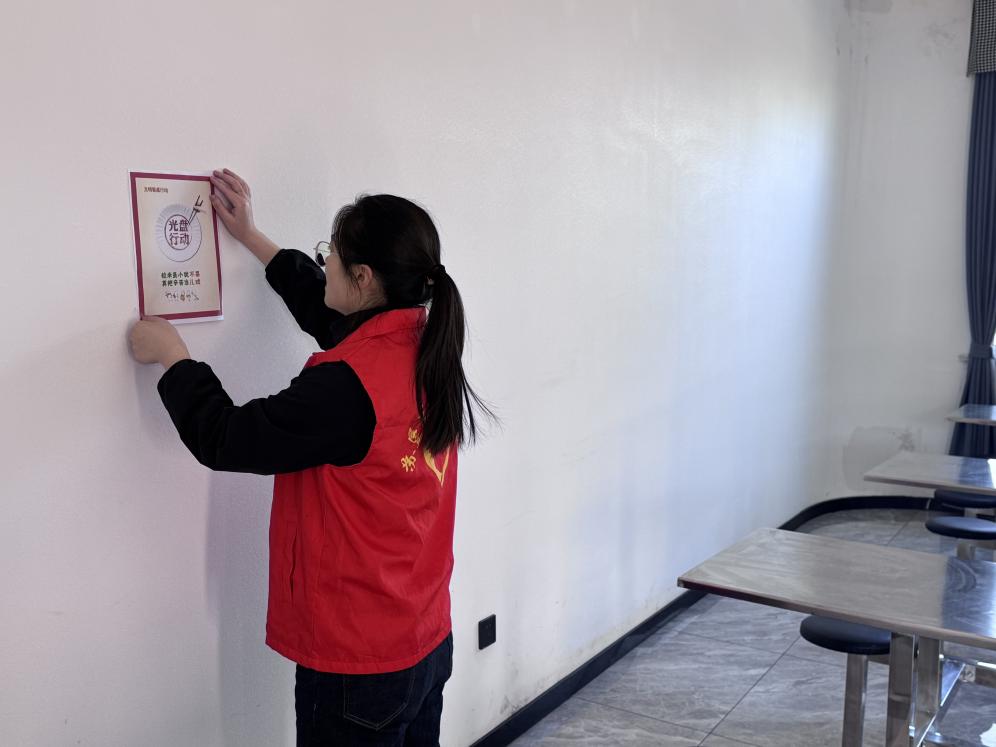活动现场暖意融融,30余名管理人员率先垂范,手持笔尖郑重签下“光盘行动”承诺书,一笔一画间尽显厉行节约的坚定决心,以实际行动引领“拒绝舌尖浪费”的新风尚。食堂内,志愿者化身“文明使者”将印有“一丝一饭当思来之不易,半丝半缕恒念物力维艰”的宣传海报整齐张贴在取餐区、餐桌旁等关键位置,古朴诗句与亮色标语交相辉映,如春风化雨般提醒着每一位就餐人员珍惜粮食、践行节约。