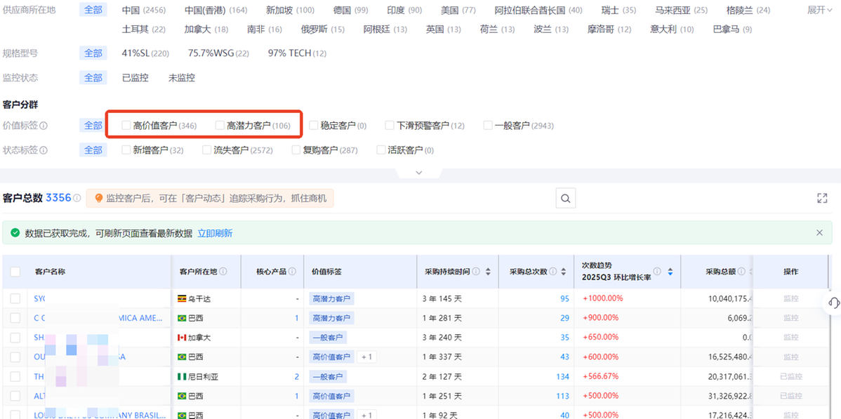 快速识别高价值客户:从百万级采购商库中筛选标杆客户、高复购客户、活跃客户,同步监测客户采购需求变化,帮业务员精准开发新客、留存老客;