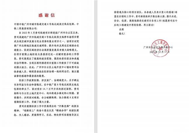 隆冬时节,暖意涌动。近日,中铁二局深圳公司广州地铁八号线北延段支线项目部收到来自广州市白云区土地开发中心的一封感谢信。信纸虽轻,情谊千钧。这已是近半年来,项目部收到的第四份来自属地单位的诚挚谢意。从攻坚克难的征拆一线,到爱心涌动的护航高考,再到润物无声的公益慈善,一摞摞感谢信,不仅记录着项目部“建一项工程,树一座丰碑,交一方朋友”的坚实足迹,更生动诠释了新时代建设者“以人民为中心”的深厚情怀与“融入地方、服务社会”的央企担当。
