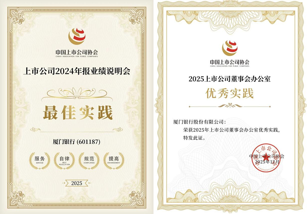 同期,在中国上市公司协会“2025上市公司董办最佳实践”评选中,厦门银行成功入选“董办优秀实践案例”。该评选从信息披露、公司治理、投资者关系等多维度进行严格评审,全国仅316家上市公司获此殊荣。