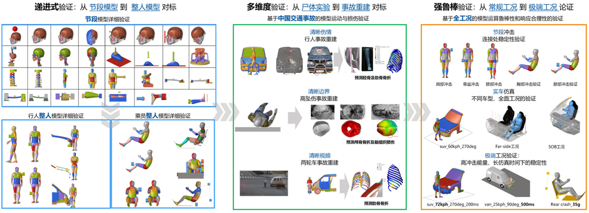 3、验证体系:递进式、多维度验证。单个模型开展42项节段级与23项整人级生物逼真度对标验证,并且引入中国真实道路事故数据进行事故重建验证;同时累计完成超百次的极端工况鲁棒性测试,全面保障模型生物逼真度与工程实用价值。