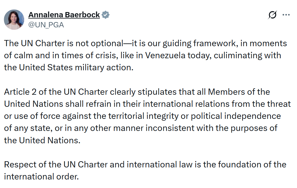 在其推特中,本届联合国大会主席安娜莱娜·贝尔伯克(Annalena Baerbock)直接列上《联合国宪章》第二条第四款: