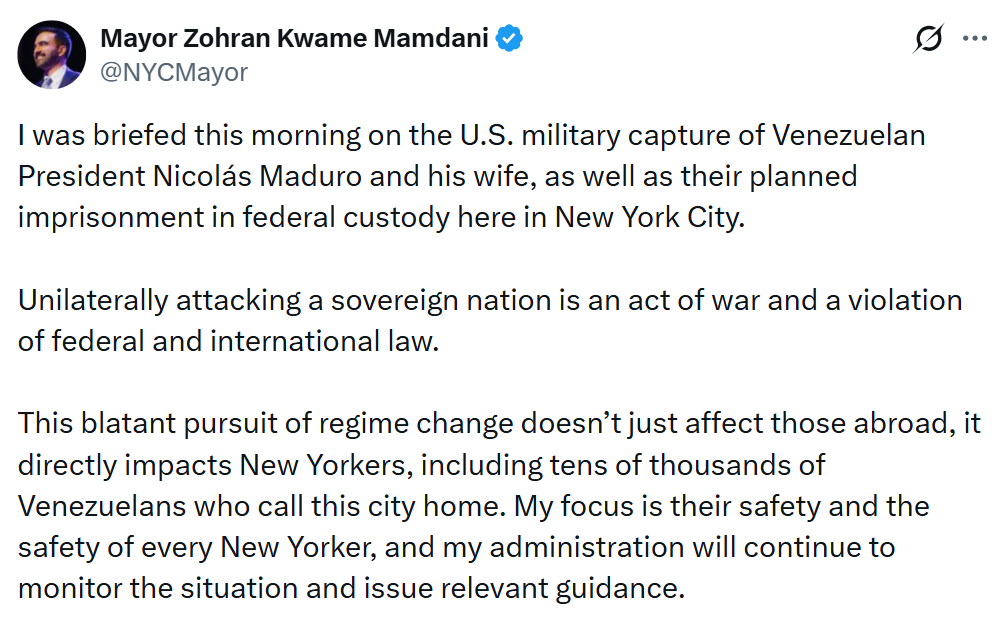 这点甚至连美国人都看不下去了。美国纽约市长佐赫兰·夸梅·马姆达尼(Zohran Kwame Mamdni)在推特上公开表示,“单边攻击一个主权国家是战争行为,违反了(美国)联邦法律和国际法。”(Unilaterally attacking a sovereign nation is an act of war and a violation of federal and international law.)