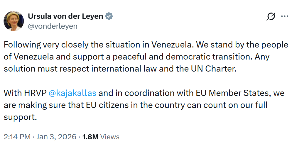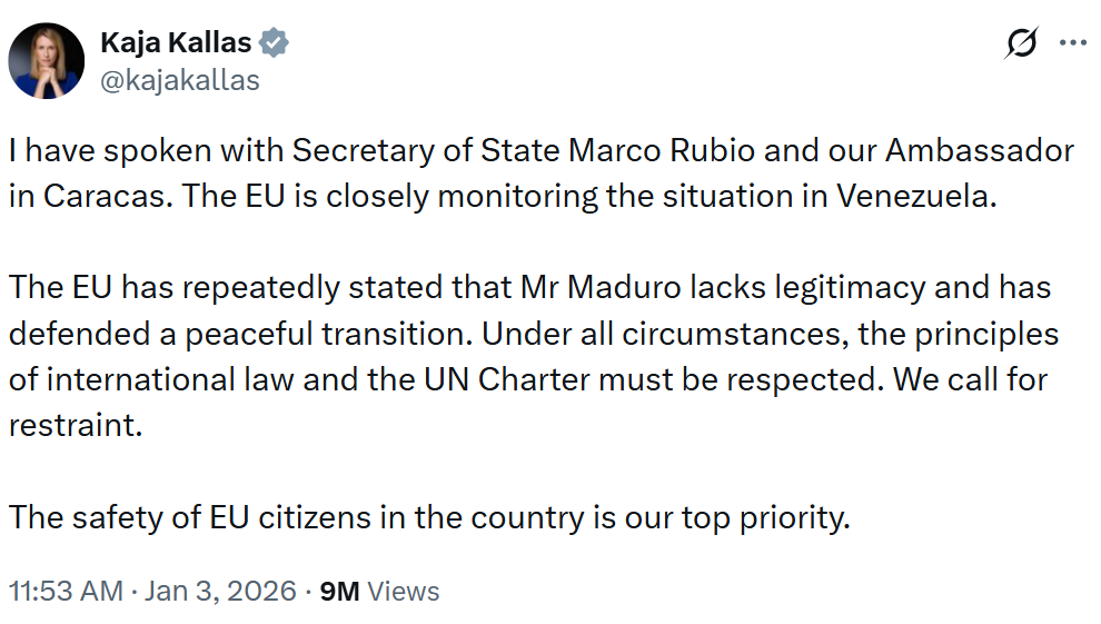 直到中午十二点左右,袭击发生五个小时后,欧盟委员会副主席兼欧盟外交与安全政策高级代表卡娅·卡拉斯才第一个做出反应。在与美国国务卿取得联系,确认马杜罗被掳走的消息后,她发了这么一条推特: