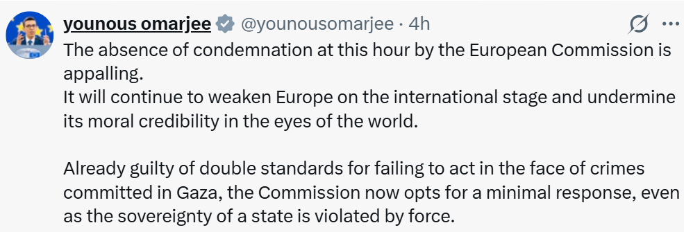 面对美国明确违反《联合国宪章》和国际法的行为,两位欧盟领导人的反应竟然如此平静,连一句批评都没有。来自法国的欧洲议会副议长尤努斯·奥马尔吉(Younous Omarjee)明显对欧盟这种表态不是很满意,他在冯德莱恩推特下留言,要求明确态度: