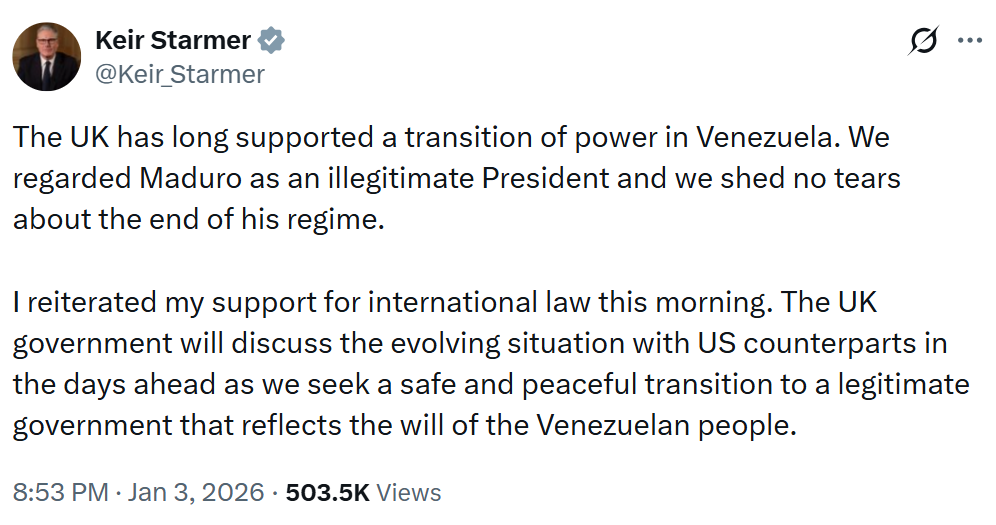 斯塔默表示,英国长期支持委内瑞拉的权力交接,而且自己今天上午重申了对国际法的支持: