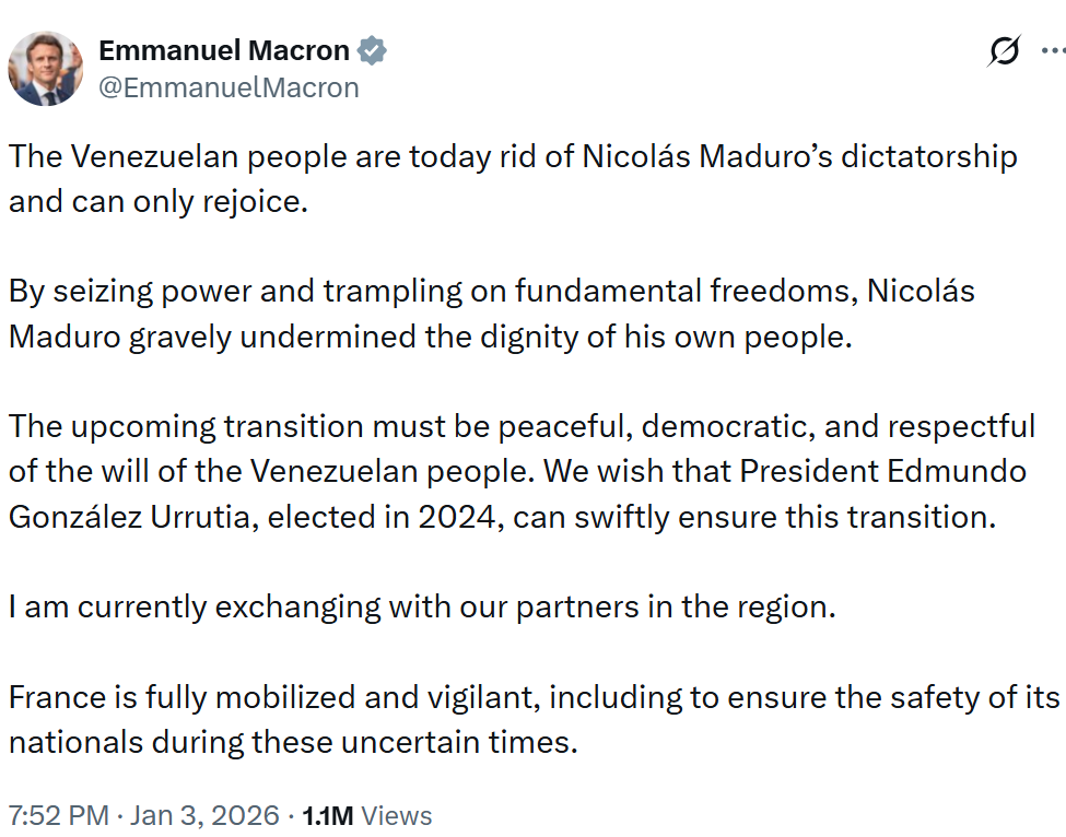 又过了两个小时,也就是美国当地时间上午11点,特朗普总统举行新闻发布会,正式宣布美国抓获马杜罗的消息和美国的态度。随后欧洲各国领导人终于开始陆续回应。